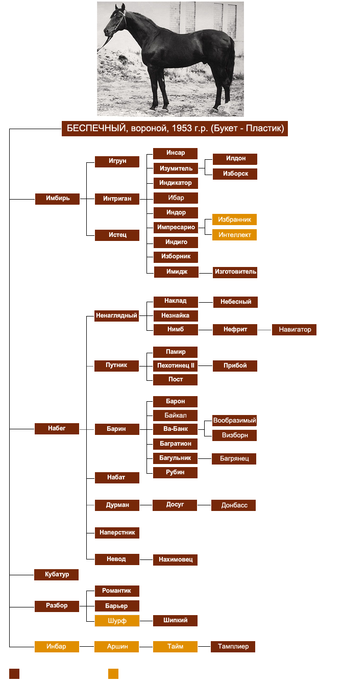 Остальные жеребцы линии Беспечного, включенные в схему, использовались довольно ограниченно и оставили след в породе, как правило, только через своих дочерей.